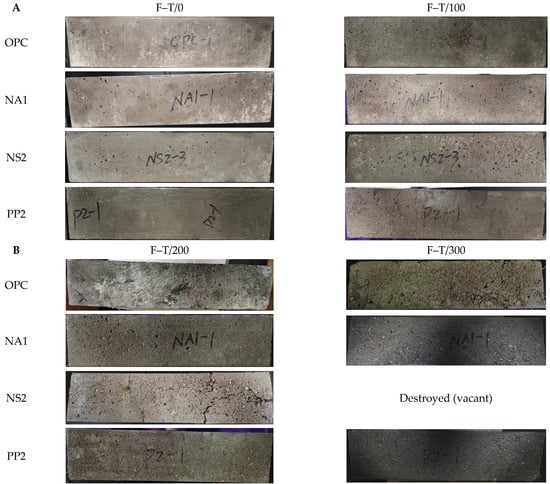 The experimental results demonstrate distinct effects of different additives on concrete’s freeze–thaw resistance. All specimens eventually showed characteristic deterioration patterns including mortar loss, fine aggregate shedding, coarse aggregate exposure, and crack formation. Comparative analysis reveals that nano-silica (NS2) adversely affected durability, causing premature structural failure before completing 300 cycles. Conversely, both nano-alumina (NA1) and polypropylene fiber (PP2) significantly improved performance—while exhibiting surface mortar loss and aggregate exposure similar to ordinary concrete (OPC), they effectively prevented structural cracking. This superior performance aligns with previous mechanistic analysis (discussed in prior sections), confirming these additives’ beneficial role in enhancing concrete’s frost resistance without compromising structural integrity.