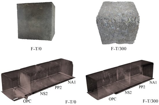 After 100 freeze–thaw cycles, the compressive strength decreased rapidly, indicating that the adverse effects of freeze–thaw action had become significant. As seen in the figure, the negative impact of freeze–thaw cycles on specimens OPC and NS2 was much greater than on specimens NA1 and PP2. Although the 100 × 100 × 400 mm3 specimen of NS2 failed after 200 cycles, the 100 × 100 × 100 mm3 specimen, despite severe surface scaling, still retained some compressive resistance, with a strength slightly comparable to that of specimen OPC. In contrast, the compressive strength of specimens NA1 and PP2 exhibited a slower decline with increasing freeze–thaw cycles, demonstrating that nano-alumina (NA) and polypropylene fiber (PP) effectively enhanced the frost resistance and durability of the concrete.