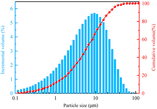 The fundamental physical properties of the tailings were determined as follows: a specific gravity of 2.6, an apparent porosity of 56.27%, and a void ratio of 2.29. The grain size distribution (GSD) was characterized using a Winner 2000 laser particle size analyzer (Jinan Winner Instrument Particle Stock Co., Ltd. Jinnan, China), with the results graphically presented in Figure 1. Key physical parameters of the FT are concisely summarized in Table 1. Based on the gradation theory [40] and the experimentally obtained GSD curve, the coefficients of uniformity (Cu) and curvature (Cc) for the FT were calculated to be 12.53 and 1.31, respectively. These values indicate that the tailings are well-graded. For this study, a novel cementitious material (designated as CP, for cementitious powder) was developed as an alternative to OPC, formulated using ground granulated blast-furnace slag as the primary precursor and alkaline chemicals (NaOH) as activators. The CP is a one-part, pre-blended binder. The activator consists primarily of sodium hydroxide combined with sodium silicate powder. The components are homogenized in a specific ratio (7:3 slag-to-activator by mass) to ensure consistent reactivity when mixed with water. The sodium silicate modulus is 1.1. This one-part formulation distinguishes it from standard two-part alkali-activated systems, simplifying on-site logistics and handling.