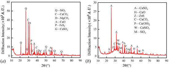 The chemical composition of FTs and CP was analyzed by using a Rigaku intelligent multi-function X-ray diffractometer. The results are presented in Figure 2 and Table 2. The main chemical component of FTs is SiO2 (68.7%), which is chemically stable and can be used as a filling aggregate in deep mining, while the main chemical component of CP is CaSO4 (60.5%).