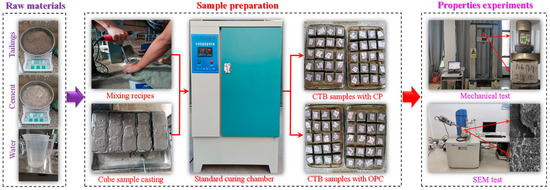 Following demolding, all specimens were sealed to prevent water loss and placed in a standard curing environment. They were cured at a constant temperature of 25 °C and a relative humidity of ≥85% for 1, 3, 7, 14, and 28 days. At the end of each designated curing interval, the samples underwent a series of characterization tests to evaluate their properties, including mechanical assessments and microstructural scanning examinations. A detailed schematic diagram illustrating the overall experimental procedure is provided in Figure 3.