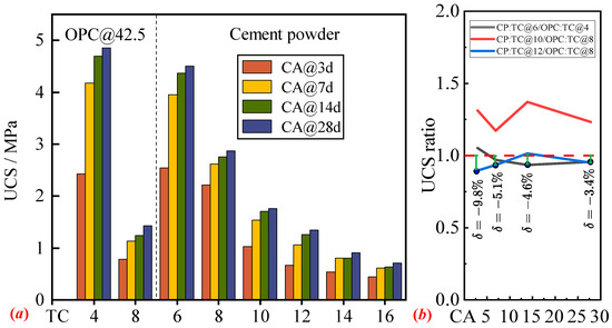 OPC is currently the most prevalent binder in underground backfill mining methods, primarily due to its established performance, yet it presents opportunities for significant cost optimization. Consequently, in this study, OPC was employed as the benchmark cementitious material for the control group. Guided by the principle of strength equivalence [30,31], the primary objective was to assess the viability of substituting OPC-based binders (at a low tailing-to-cement ratio, TCR) with the novel CP binder at a higher TCR. To simulate realistic field applications, all experiments were conducted based on the operational parameters of the Wushan Copper Mine, specifically a filling slurry solid content (SC) of 73%. Therefore, a comprehensive comparative investigation was undertaken to analyze the UCS of various CTB samples. This analysis included tailing–OPC mixtures with TCRs of 4 and 8, and tailing–CP mixtures with TCRs ranging from 6 to 16. It is important to note that a consistent curing age (CA) schedule of 1, 3, 7, 14, and 28 days was applied across all experimental scenarios. The results of this comparative UCS analysis for both tailing–OPC and tailing–CP samples are systematically presented in Figure 4.
