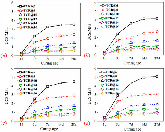 Figure 5. Effects of CA and TCR on UCS evolution behavior of CTB with SC of (a) 71%, (b) 72%, (c) 73%, and (d) 74%, respectively.