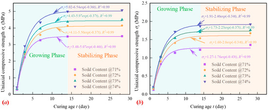 Cemented tailing backfilling (CTB) is an effective technique for mitigating these environmental hazards and maintaining ground stability. It involves mixing tailings, solid waste, water, and cementing binders to form a pumpable slurry that solidifies in the mined-out voids [2,6,9,10,11]. CTB provides mechanical support for stopes, controls ground pressure [12], and reduces surface subsidence [13] while improving ore recovery efficiency [14,15]. Consequently, it has become a standard practice in underground mining worldwide. The uniaxial compressive strength (UCS) is the most critical indicator for evaluating the safety and mechanical stability of CTB [16,17]. Its development is affected by factors such as curing conditions, binder type and dosage, solid content (SC), and the tailing-to-cement ratio (TCR) [18,19,20,21,22]. Among these, TCR is significant, as it governs both strength evolution and backfilling cost [23].