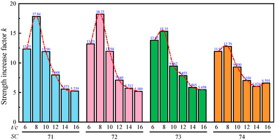 Figure 7. Effect of SC (71%, 72%, 73%, and 74%) and TCR (6, 8, 10, 12, 14, and 16) on strength increase factor of CTB.