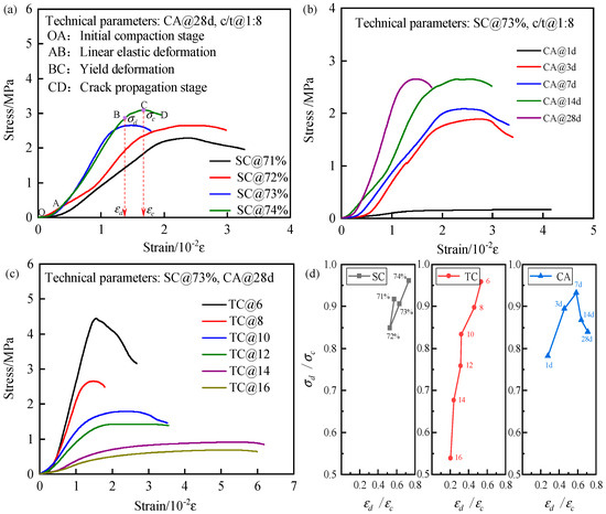 When comparing the impact of multiple factors on the morphology of the stress–strain curve, the alteration of the curve type remained indistinct within the narrow control range of SC (71–74%). However, the influence of CA and TCR on the transformation of this behavior was more pronounced. For instance, at a curing age of just 1 day, the stress–strain response exhibited typical plastic yield properties. As the curing period progressed, a post-peak strain softening characteristic became more evident. At a 3-day curing age, the stress–strain curve exhibited a stable pattern of change, although its maximum strength was still capable of further enhancement. The impact of TCR on the curve was more prominent than that of SC or CA. With an increasing TCR, the stress–strain curve progressively shifted from a strain-softening behavior to a yield flow-softening response, ultimately leading to persistent plastic yield characteristics. Figure 8d presents a comparison of the influence of the control parameters SC, TCR, and CA on normalized damage stress ( σ d / σ c ). These results show that SC and CA display opposing nonlinear effects on this parameter, whereas the impact of TCR is nearly linear.