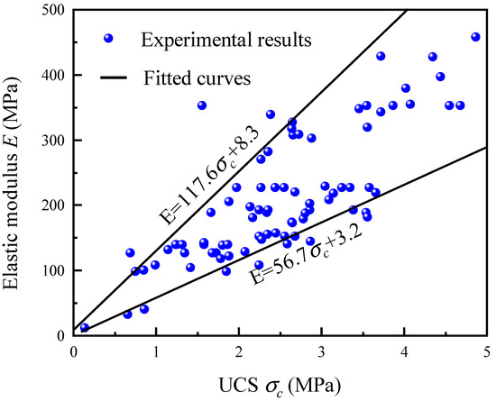 Drawing from the stress–strain curve results illustrated in Figure 8, the impact of the CA, SC, and TCR on the elastic modulus is presented in Figure 9. The findings reveal that both CA and SC exert a favorable influence on the enhancement of the elastic modulus. Conversely, the TCR exerts a deleterious effect on the elastic modulus, causing a decayed trend as the TCR increases. An in-depth examination of the correlation between elastic modulus E and UCS σ C is undertaken based on the preliminary findings presented in Figure 5. This analysis is visualized in Figure 10 by depicting both the empirical data and corresponding fitting curves. It is discerned from these results that the intersection points between elastic modulus E and σ C is roughly located between fitting curve E = 117.6 σ C + 8.3 and E = 56.7 σ C + 3.2 .