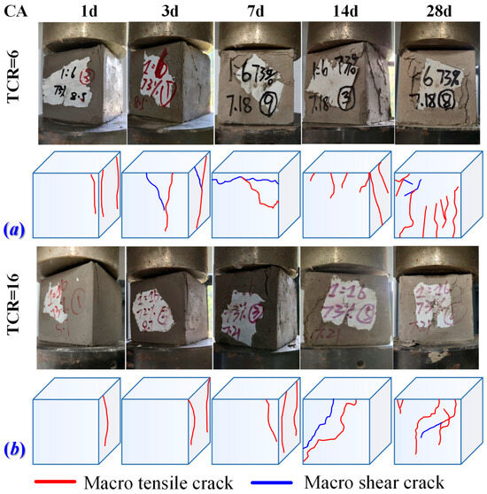 Figure 11. Failure modes of uniaxial compression for CTB with an SC of 73% at various CA schemes: (a) TCR = 6; (b) TCR = 16.