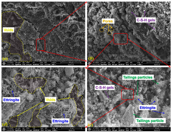 The SEM microstructure of CTB fragments, observed at various magnifications, is illustrated in Figure 12. The examined fragments were derived from the failed CTB samples prepared with an SC of 73% and a TCR of 6 and cured for 28 days. The results indicate that, upon examination at 500× magnification, the 28-day cured samples possess what appears to be a consistent and compact microstructure. However, upon closer inspection at higher resolutions (as shown in Figure 12b–d), it becomes apparent that this seemingly uniform and dense structure comprises a variety of substructures. These include a gelatinous mass, tailing particles, pores, and voids, forming a porous, honeycomb-like structure. This finding agrees with previous research [24,29,36]. The primary formation of these porous structures can be attributed to the spatial arrangement and intergrowth of hydration products, such as amorphous and flocculent C-S-H gels and needle-like ettringite, which are generated during the hydration process. It is particularly noteworthy that these hydration products encapsulate the adjacent tailing particles and intertwine with the nearby loose tailing materials. This action creates a solid and cohesive coarse aggregate through bonding effects, reducing porosity and improving the strength of the microstructural skeleton inside the CTB samples. This observation explains the inherent mechanism of compressive strength development in the backfill material from a microscopic perspective, facilitating a better understanding of the material’s macroscopic properties.