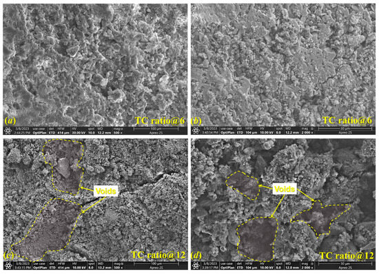 Figure 13. Surface morphology of 28-day cured CTB samples at the SC 73% with a TCR of 6 (a,b) and 12 (c,d), respectively.