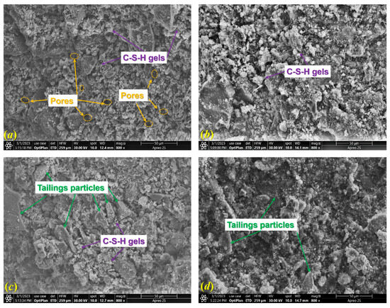 Figure 15. The microstructure of the CTB with a TCR of 8 and an SC of 73% after (a) 3 days of curing, (b) 7 days of curing, (c) 14 days of curing, and (d) 28 days of curing, respectively.