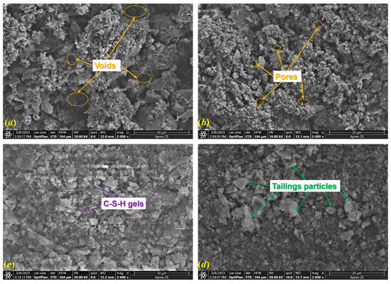 The influence of SC on the microstructure is illustrated in Figure 14, which displays micrographs of a CTB with a 28-day curing age and a TCR of 8, prepared at SCs of 71%, 72%, 73%, and 74%, respectively. The results consistently show that the micromorphology of the CTB is characterized by an incompletely formed, porous structure, with voids scattered in a disordered arrangement throughout the entire matrix space. Further observation confirms that this structure is primarily composed of C-S-H gel, pores, and embedded tailing particles. Notably, despite the increase in SC from 71% to 74%, there was no discernible variation in the overall compactness or fabric of the microstructural matrix. Therefore, it can be reasonably inferred that minor fluctuations in the SC of the CTB, under otherwise identical technical parameters, would not have a significant impact on the overall microstructure and morphology of the resulting CTB fragments.