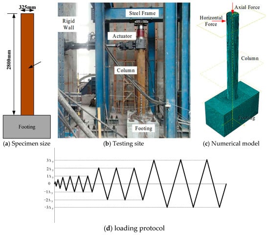 This article selects the specimen named GH-10-280 from Ref. [28] as the physical reference model. The height of the CFST column is 2800 mm, with an outer diameter of 325 mm, and the thickness of the seamless steel tube is 10 mm. The column and the footing are connected as a whole by being filled with concrete, with a compressive strength of 34.1 MPa. The specific dimensions of the test specimen are shown in Figure 1a. Considering the self-weight of the upper structure, the design axial compression ratio of the column is 0.1. First, the footing is fixed integrally using bolts, and a vertical load of 528 kN is applied to the top. Then, a horizontal actuator is used to apply a displacement load, as shown in Figure 1b.