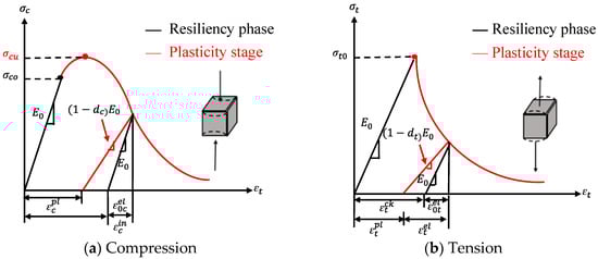 This article employs Abaqus/Standard [29] to simulate low-cycle repeated load tests on concrete-filled steel tubes. This software is widely used in static analysis, large deformation analysis of components, and corrosion analysis, among others [30,31,32]. To better simulate the stiffness degradation characteristics of concrete under low-cycle repeated loads, this article utilizes a plastic damage model to characterize its properties. The stress–strain relationship of the CDP model [33,34] under uniaxial compression and tension is shown in Figure 2. The CDP model was first proposed by Lubliner et al. [35] and modified by Lee and Fenves [36]. The stress–strain relationships for concrete’s uniaxial compressive and tensile behavior, including the post-peak inelastic section with material stiffness degradation, can be expressed as