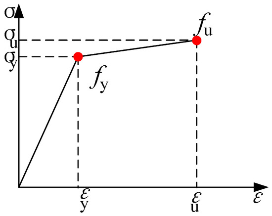 In this study, a bilinear model was employed to simulate steel reinforcement, as illustrated in Figure 3. The specific parameters of steel can be referred to in Table 2. The yield strength of steel is 277 MPa, the ultimate strength is 316 MPa, and the yield strain is 1300 με. Additionally, in this paper, concrete is represented using hexahedral 8-node solid elements, while steel tubes are represented using shell elements. The contact between the two is set to frictional hard contact, with the friction parameter set to 0.3. The boundary conditions are consistent with the experimental conditions, where the ground beam is fully restrained and a vertical load of 528 kN is applied to the top. Subsequently, a horizontal load is applied to the coupled reference points, and the loading system adopts displacement loading.