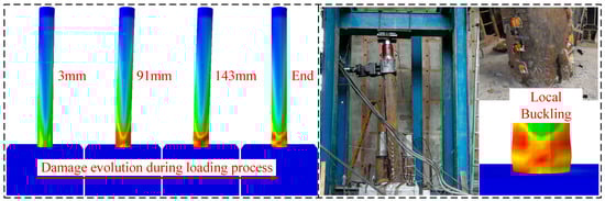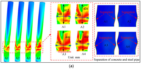 Figure 6 illustrates the failure modes of CFST columns. As shown in Figure 6a, the failure locations of the columns are primarily concentrated at the bottom, where significant plastic damage and local buckling occur. The local buckling was induced by the compression of the stretched-out steel tube. The ultimate state is defined as the state with the displacement corresponding to the 85% of the maximum lateral force in the descending stage. As the axial compression ratio increases, the extent of damage presented as the strain in the bottom region gradually expands. The specimen with an axial compression ratio of 0.15 ultimately exhibits a horizontal distance of 348 mm in terms of damage deformation, whereas the horizontal distance for the specimen with an axial compression ratio of 0.3 is 458 mm. Additionally, local separation occurs between the inner wall of the steel tube and the concrete core. This separation is attributed to the large deformation of the steel tube due to local yielding, coupled with the relatively poor deformation capacity of the concrete. The inability of the two materials to coordinate leads to this separation phenomenon.