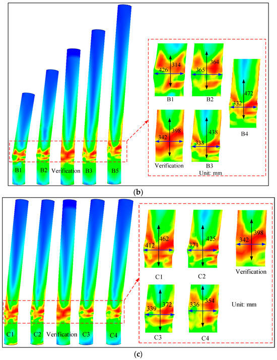 In addition, the damage modes of CFST column with different confinement coefficients are shown in Figure 6c. In this paper, the confinement coefficient is increased by increasing the thickness of the steel tube, which improves the overall performance of the CFST column and enhances its restraining ability. Therefore, the local damage range tends to decrease.