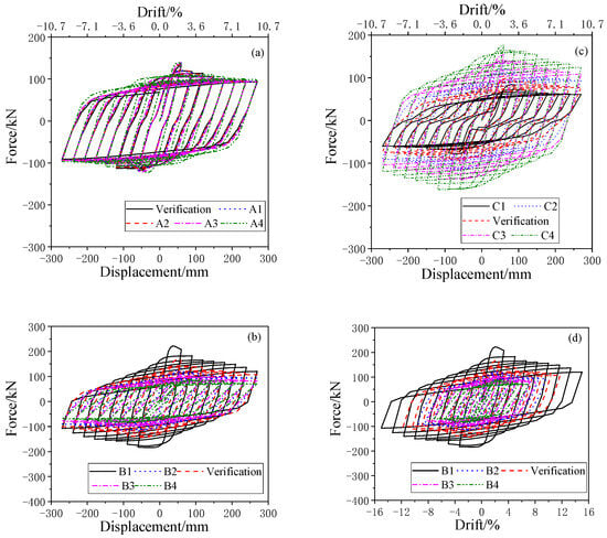 Hysteresis curves of concrete-filled steel tube: (a) axial compression ratio, (b) slenderness ratio, (c) confinement coefficient presented by displacement and (d) confinement coefficient presented by drift.