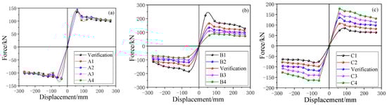 Figure 4 shows the comparison between numerical results and experimental results of CFST columns. At the beginning of loading, the CFST column is in an elastic state. As the top displacement reaches 91 mm, severe plastic damage occurs at the bottom of the column. When it finally fails, severe buckling occurs at the bottom of the column, which is consistent with the experimental phenomenon. In addition, as can be seen from Figure 5, the hysteresis curves of the two are almost identical, and the skeleton curves are also highly similar. The peak loads of the experiment and numerical simulation are 135.9 kN and 137.1 kN, respectively. In summary, the numerical model successfully reproduces the experimental phenomena and results, verifying the reliability and effectiveness of the model.
