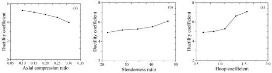 Ductility coefficient of concrete-filled steel tube: (a) axial compression ratio, (b) slenderness ratio, and (c) confinement coefficient.