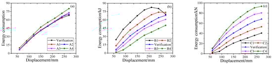 Figure 11 depicts the energy dissipation curves of various specimens of CFST columns. As evident from the figure, the axial compression ratio has a minor impact on the energy dissipation performance of columns. The energy dissipation capacity gradually decreases with an increase in the slenderness ratio. The confinement ratio positively influences the energy dissipation performance of columns. To more precisely compare the differences in energy dissipation, this paper calculates the total energy dissipation values of each specimen. For the specimen with an axial compression ratio of 0.1, the total energy dissipation value is 334 kJ, while the corresponding value for a ratio of 0.3 is 384 kJ. Furthermore, when the slenderness ratio is 22.2, the total energy dissipation of steel tube concrete is 501 kJ, which is 1.50 times higher than that of the initial verification model. The total energy dissipation of steel tube concrete with a confinement ratio of 1.56 is 487 kJ, which is 1.46 times higher than that of the initial verification model.
