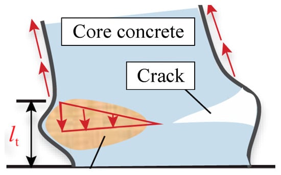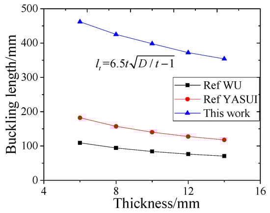 Figure 13 shows the calculation formula proposed by YASUI [37] and WU et al. [38] for the local buckling length of circular steel reinforced concrete columns. From Figure 13, it can be seen that there is a significant error between the predicted results of the calculation formulas of YASUI [37] and WU et al. [38] and the experimental results, underestimating the local buckling length of the circular CFST column. Based on the existing calculation formula and combined with experimental data for fitting by the least squares method (determination coefficient R2 = 0.937), this paper modifies and obtains the calculation formula applicable to the local buckling length lt of circular CFST columns, as follows: