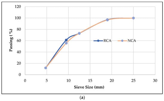 (a) Particle Size Distribution of recycled concrete aggregate (RCA) and Natural concrete aggregate (NCA). (b) Particle Size Distribution of Fine aggregates.