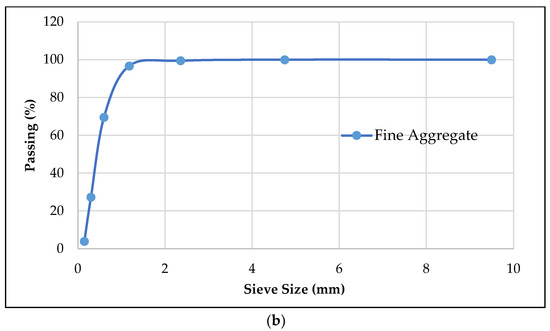 The fine aggregate used was natural siliceous sand. The recycled concrete aggregate (RCA) was sourced from laboratory waste concrete (parent strength: 35–40 MPa), manually crushed, and sieved to a maximum size of 20 mm [61]. To ensure a valid comparison, the particle size distribution of the RCA was matched to that of a standard natural coarse aggregate, as shown in Figure 1a, while the fine aggregate gradation is presented in Figure 1b.