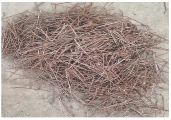 Hooked-end steel fibres (HSF) with a length of 34 mm, diameter of 0.9 mm, tensile strength of 1200 MPa, and density of 7750 kg/m3 were used at a volume fraction of 0.5% [56,57] as shown Figure 2.