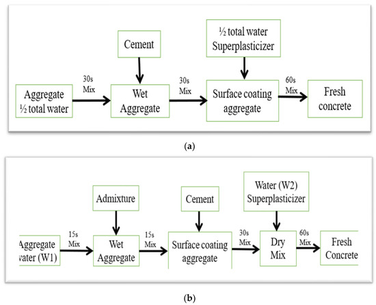 Mechanical mixing was performed using two distinct methods: the double-mixing (DM) and triple-mixing (TM) techniques. The double-mixing (DM) procedure consisted of two primary stages: (1) pre-wetting the recycled concrete aggregate (RCA) with 50% of the total mixing water, followed by (2) the introduction of the cementitious materials, sand, remaining water, and chemical admixtures [36,42]. The triple-mixing (TM) technique involved a more complex sequence: (1) the RCA was initially coated with a slurry of admixtures, mixed at a water-to-binder ratio of 0.38 for 15 s, after which (2) the remaining ingredients were added to complete the mix [39]. The procedural sequences for both the DM and TM methods are illustrated schematically in Figure 3a,b.