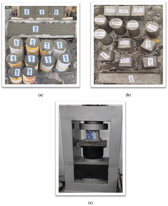 A total of 574 specimens were prepared for mechanical and durability testing, which include 100 mm cubes for compressive strength, Ø100 × 200 mm cylinders for split tensile strength and rapid chloride penetration test (CPT), and 100 × 100 × 500 mm prisms for flexural strength. Moulds filling was made in three layers by a vibrating table compaction per layer. After 24 h, specimens were demoulded and then cured (in potable water at a constant temperature of 20 ± 2 °C) to specified test age [67]. The casting, demoulding and testing processes are shown in Figure 4a–c respectively.