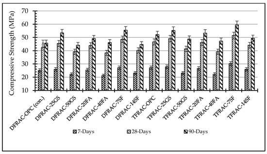 The TM method provided superior improvement compared with the DM method, with an average percentage increase of 11% in compressive strength of SFRAC over that achieved by SFRAC obtained using DM (p < 0.05). Interestingly, the TFRAC-7%SF combination even outperformed all DFRAC compositions as illustrated in Figure 5. The error bars on the data variance reaffirm the integrity of these trends.