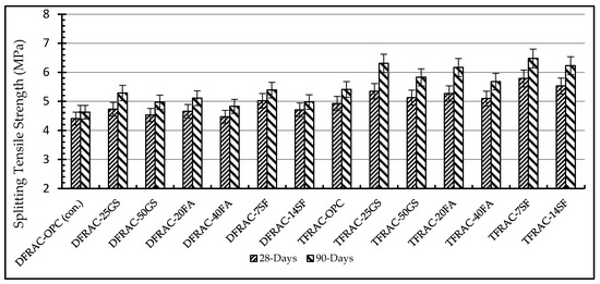 The use of the TM method improved the splitting tensile strength of TFRAC and TFRAC largely exhibited an increased splitting tensile strength by around 29% in comparison with mixtures added with DM-treated RA, as presented in Figure 6. Statistical analysis by one-way ANOVA also confirmed these differences were significant (p < 0.05).