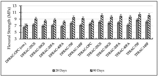 The flexural strength of fibre-reinforced concrete is a critical design property that is primarily enhanced by the capacity of fibres for crack bridging and must be determined experimentally, as it cannot be reliably predicted from compressive strength. As illustrated in Figure 7, both mixing methods improved flexural strength over the control, with the triple-mixing technique (TFRAC) yielding statistically superior results to the double-mixing method (DFRAC) across all mixtures (p < 0.05). The most significant enhancement was achieved with the TFRAC method incorporating 7% silica fume (SF), which exhibited a 31% increase in flexural strength over its DFRAC counterpart at 90 days. Substantial gains were also confirmed for TFRAC mixtures with 25% GGBS (29%) and 20% fly ash (FA) (25%). While higher admixture contents (50% GGBS, 40% FA, 14% SF) still conferred a statistically significant improvement, the benefits were less pronounced, indicating that the efficacy of the TFRAC method is optimized at specific replacement levels.