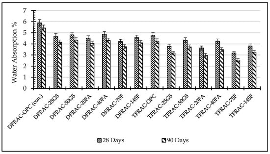 The contribution of mineral admixtures and mixing method to water resistance is shown in Figure 8. Statistical analysis indicated that the use of mineral admixture indeed improved water absorption resistance in both DFRAC and TFRAC (p < 0.05), with a further and constant 19–22% improvement obtained using triple mixing technique (TFRAC) over what was observed in corresponding DFRAC mixes. The reduction in water absorption was in the range of 21–53% about control mix. The optimum admixture was found to be 7% silica fume (SF), with a 46–53% decrease obtained. Next 20% FA and 25% GGBS had percent reduction ranges as 38–45% and 36–41%, respectively. Significantly more limited responses were found with increased admixture dosage (14% SF, 40% FA, 50% GGBS) but improvements remained statistical although less notable; signifying a saturation in the applied admixture quantity for performance gain.