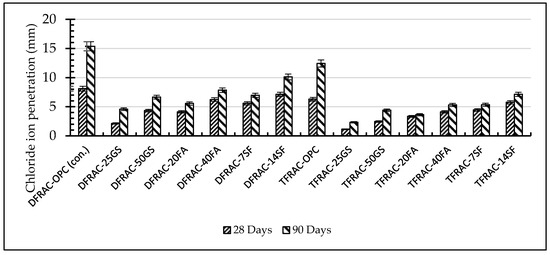 They proposed that these performance improvements would originate from combined effects. The reduction in the overall permeability of the admixed concrete is attributed to pozzolanic reactions and filler effects, whereas high alumina content in GGBS and fly ash contributes to improving the chloride binding capacity [14,15,23]. The TFRAC process as statistically more significant indicates the importance in establishing a homogenized network and a refined pore-network, for permeability to be further decreased. The observation that GGBS contributes towards the major improvement in chloride barrier agrees to its substantial efficacy as an admixture for improving chloride resistance [15].