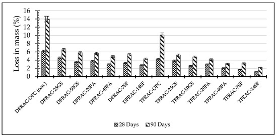 Loss in Mass due to acid attack of DFRAC and TFRAC after 28 and 90 days of immersion in 5% H2SO4 solution and Error bars represent ±1 standard deviation.
