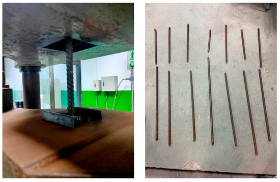 For each type of bar, three specimens measuring 600 mm in length were tested to ensure representative and consistent results. During testing, the load and elongation were continuously recorded to capture both the elastic and plastic behavior of the steel bars. The stress–strain responses obtained in this way confirmed that all reinforcing bars exhibited typical ductile behavior, with distinct yield and strain-hardening phases. The average yield and tensile strengths derived from these tests are summarized in Table 2.