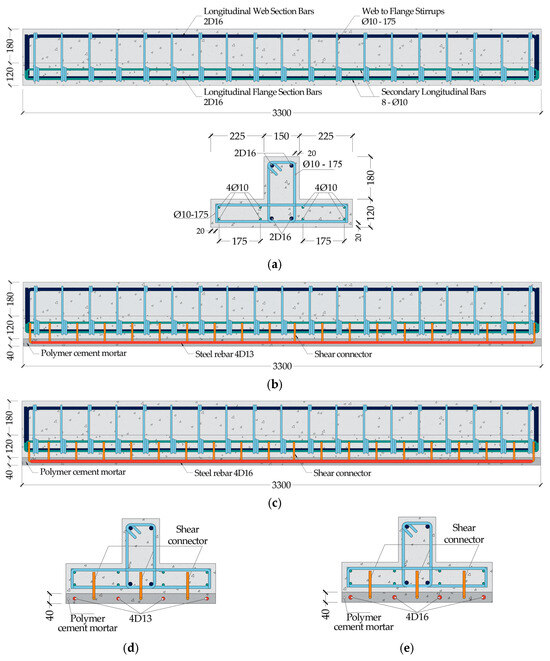 The internal reinforcement comprised two deformed steel bars, 16 mm in diameter (D16), positioned longitudinally in both the compression and tension zones of the web. The flange was reinforced with eight plain round bars, 10 mm in diameter (Ø10), distributed at 175 mm spacing. The choice of plain bars for the flange was intentional, and was made to minimize mechanical interlock at the interface and to better represent the relatively smooth surface conditions typically encountered in slab–beam connections of existing structures. This configuration also facilitated controlled cracking and relatively uniform strain development along the flange reinforcement during testing, with minimal local stress concentrations, and ensured that the measured strain response reflected the overall flexural behavior rather than localized bond effects. To prevent premature shear failure, Ø10 stirrups were provided as transverse reinforcement along the entire span, also spaced at 175 mm. A 20 mm concrete cover was applied over the stirrups to meet the durability requirements. Figure 4a presents a schematic overview of the specimen design and reinforcement configuration.