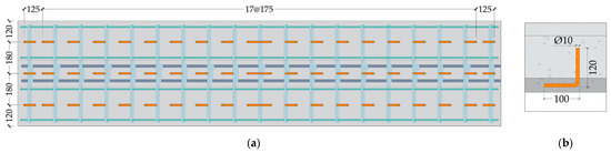 Application of shear connectors (units: mm): (a) placement of shear connectors on strengthened beams; (b) detail of a shear connector.