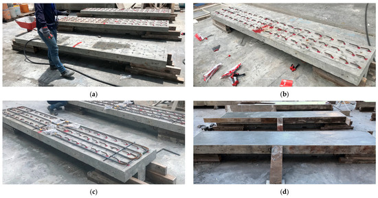 Following surface preparation and installation of the shear connectors, steel reinforcement was carefully arranged within the designated overlay zone. A concrete bonding agent was applied to the prepared substrate to enhance adhesion between the existing concrete and the PCM layer. The PCM was then cast onto the tensile flange surface of the beams, ensuring full integration with the underlying structure. Following this placement, the overlay was subjected to wet curing conditions and allowed to age for 28 days to acquire the appropriate mechanical properties. Figure 6 illustrates the complete sequence of the strengthening procedure.