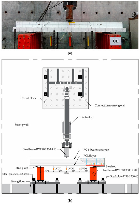 Graphical illustration of the loading arrangement and boundary conditions adopted for beam testing: (a) photograph of the specimen undergoing testing; (b) details of the components and instrumentation (units: mm).