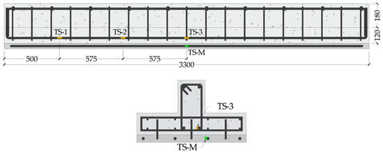 The loading procedure was performed using a servo-controlled hydraulic actuator with a capacity of 500 kN, operated in displacement control mode at a steady rate of 0.4 mm/s until failure occurred. Beam deflection was measured with linear variable differential transformers (LVDTs), and the applied loads were monitored through a calibrated load cell. Strain gauges were affixed to D16 longitudinal bars embedded in the NSC to record strain in the tensile reinforcement, designated TS-1, TS-2, and TS-3. In the strengthened specimens, an additional strain gauge (TS-M) was installed at mid-span on the longitudinal bar embedded within the PCM overlay to capture strain behavior specific to the composite layer. The positioning of all steel strain gauges is shown in Figure 8.