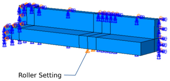 The boundary conditions were defined to simulate the support configuration used in the experimental setup. The pinned end was modeled by restraining translational movement in both the x- and y-axes, while the roller support allowed translation along the x-axis but restricted displacement in the y-direction. The applied load was simulated as a concentrated vertical displacement imposed at the mid-span loading point, corresponding to the actuator position throughout the test. This displacement-controlled loading method allowed the model to reproduce the gradual monotonic loading process observed experimentally and to capture the complete load–deflection response up to failure. These boundary conditions are graphically represented in Figure 11.