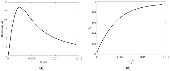 The concrete damage plasticity (CDP) model, an advanced constitutive framework that is widely utilized within the ABAQUS platform for simulating RC structures [85], was employed to represent the nonlinear and inelastic behavior of concrete. The CDP model, originally developed by Lubliner et al. [90] and subsequently enhanced by several researchers [91,92,93], integrates both plasticity and damage mechanics into a unified formulation. It captures failure in tension and compression through isotropic hardening plasticity combined with scalar damage variables, which represent stiffness degradation due to microcracking. This dual mechanism enables the model to provide a realistic reflection of the progressive deterioration and complex load–deformation response of concrete under multi-axial stress states. The stress–strain relationships adopted for the simulation were derived from the experimentally measured average compressive strength of 28.69 MPa, as illustrated in Figure 12a,c.