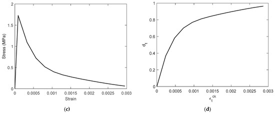 The constitutive model for concrete: (a) stress–strain relationship in uniaxial compression; (b) compressive damage parameter; (c) stress–strain relationship in uniaxial tension; (d) tensile damage parameter.