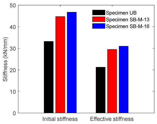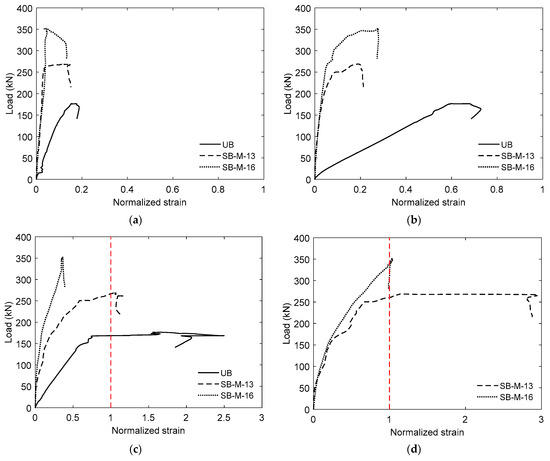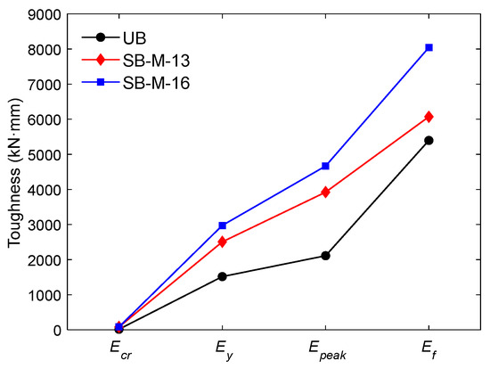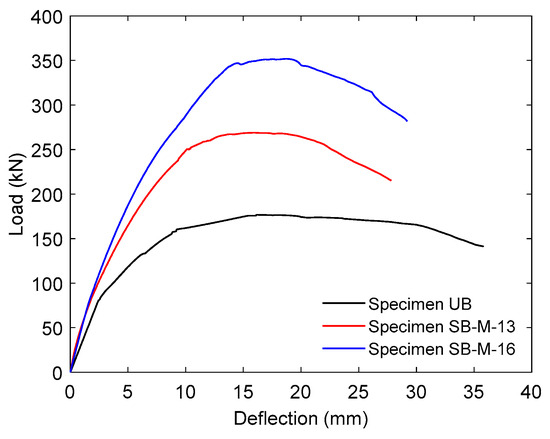 Figure 13 illustrates the mid-span load–deflection behavior of the reference specimen (UB) together with the results for the specimens strengthened with high-strength PCM and reinforced using steel rebars (SB-M-13 and SB-M-16). All beams initially demonstrated linear elastic behavior until the emergence of the first visible cracks and the onset of steel yielding.