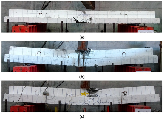 Documented failure modes of all tested RC T-beams; (a) specimen UB [68]; (b) specimen SB-M-13; (c) specimen SB-M-16.