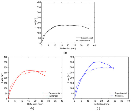 As previously stated by Nugroho et al. [68], the unstrengthened beam (UB) underwent initial flexural cracking at mid-span at a load of 34.42 kN. As loading continued, the primary crack expanded and extended downward through the flange, which was accompanied by the emergence of additional flexural cracks, although no shear cracks were observed during the test. The tensile reinforcement yielded at 168.52 kN, marked by a noticeable plateau in the load–deflection response. The ultimate load-bearing capacity peaked at 176.66 kN, beyond which the beam failed due to propagation of the dominant mid-span crack into the compression zone. Figure 14a shows that failure was governed by a ductile flexural mechanism, culminating in concrete crushing within the compression region in the final stage.