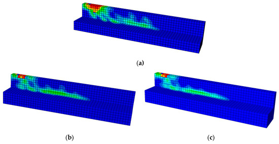 The coefficients and denote the ratios of plastic strain to inelastic compressive strain and the tensile cracking strain, respectively. Consistent with established guidelines, a value of 0.60 was adopted for compression and 0.90 for tension, following the recommendations by Wei et al. [94,95]. Figure 12b,d illustrate the progression of the compressive and tensile damage in the concrete domain, which show the unique degradation patterns linked to each respective failure mechanism.